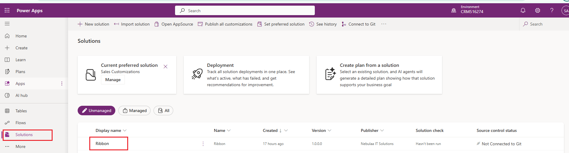 Step 1: Create a new solution (Start by creating a dedicated Solution to keep your ribbon customizations clean)