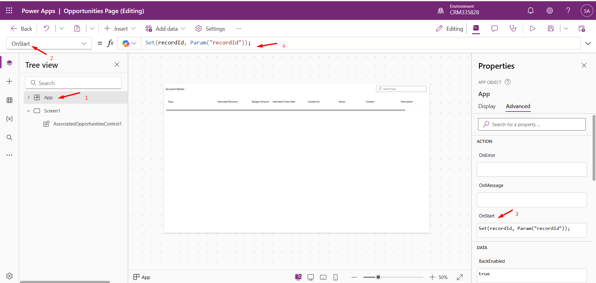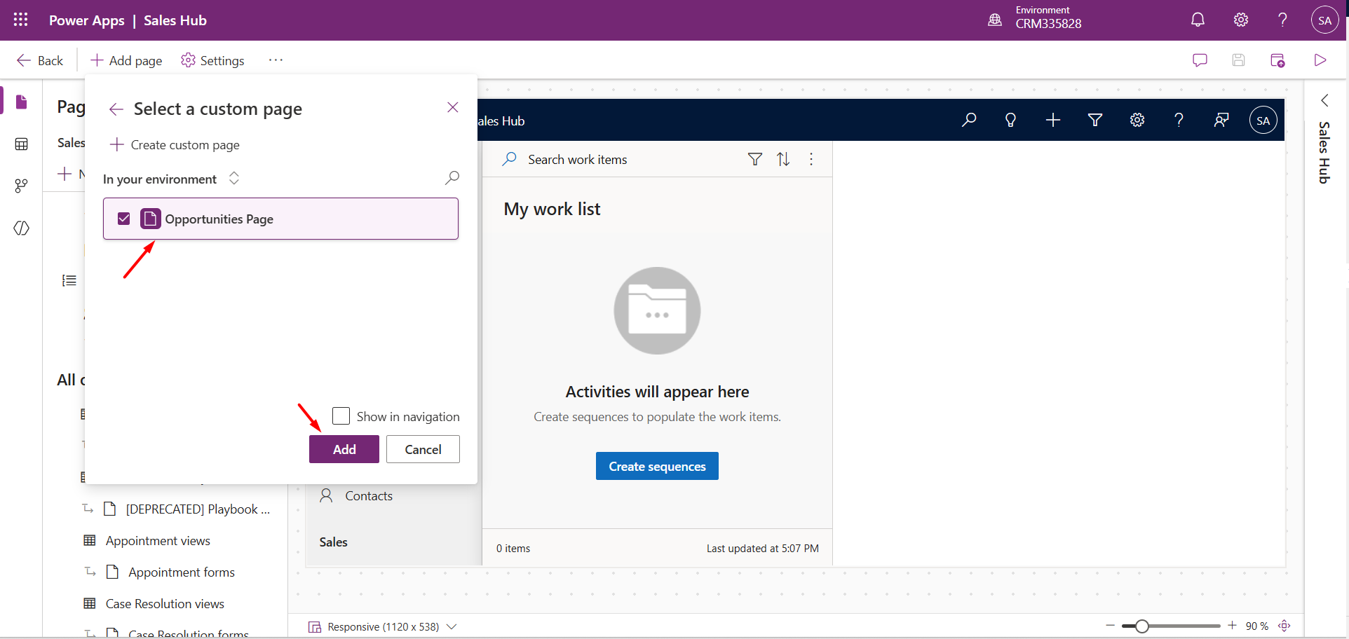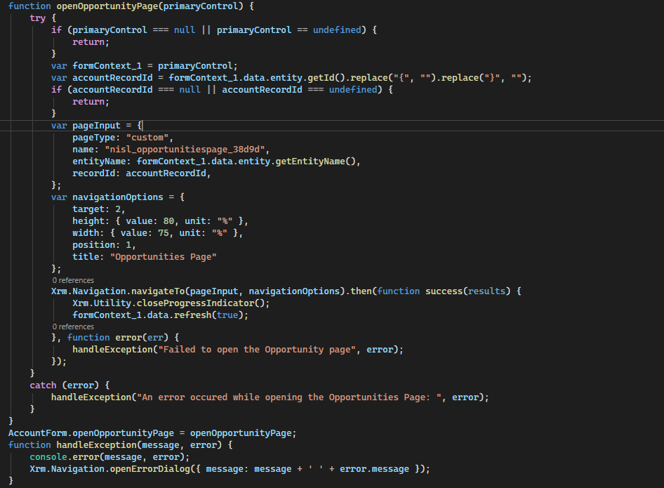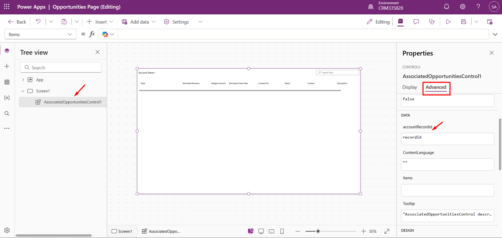 In our scenario, we have an Opportunities button on the Account form. When clicked, it should open a Custom Page in a pop-up window that hosts a PCF control displaying a list of associated Opportunities.