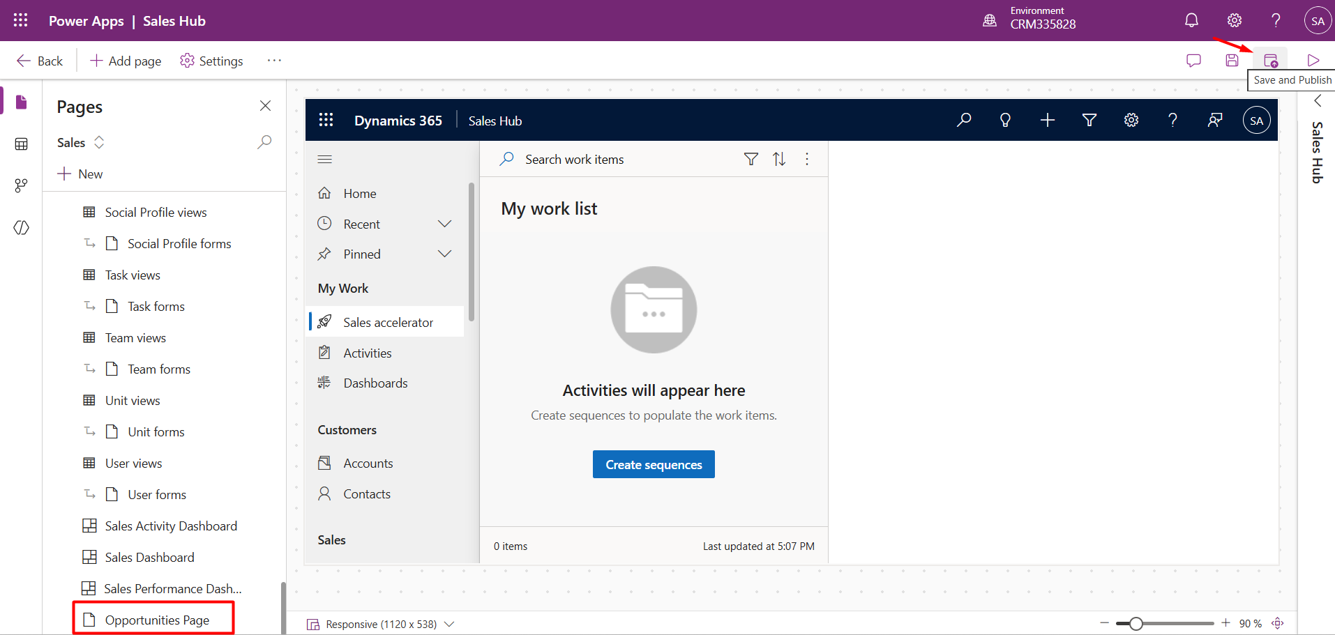 Custom Page opens in Power Apps Editor. Click the Publish button from the command bar and provide a name for the custom Page.