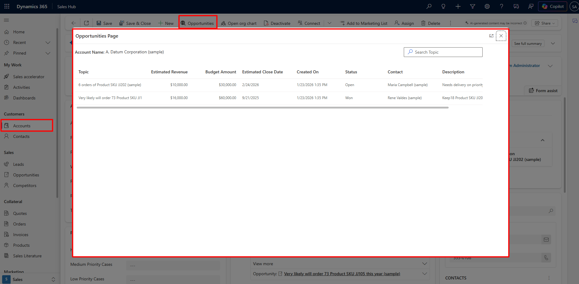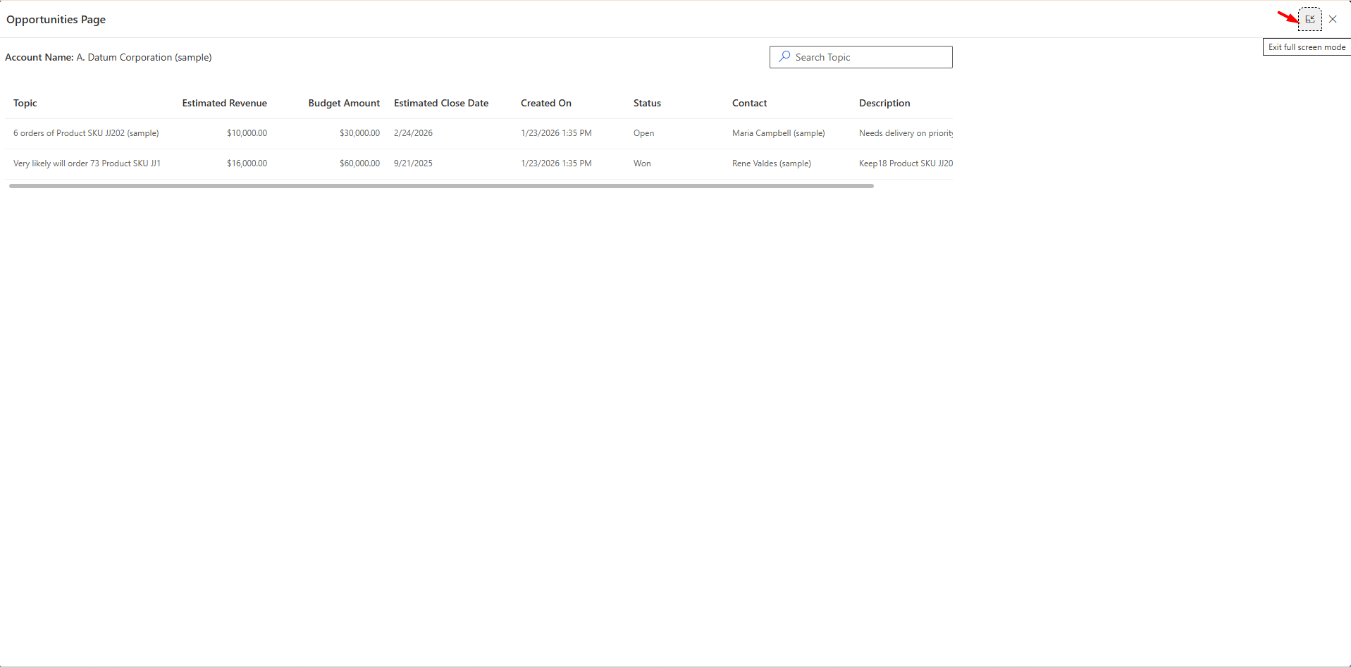 Open the Account record à Click on the Opportunities ribbon button. The Custom Page opens a pop-up window. The PCF control loads the associated opportunities as shown below.