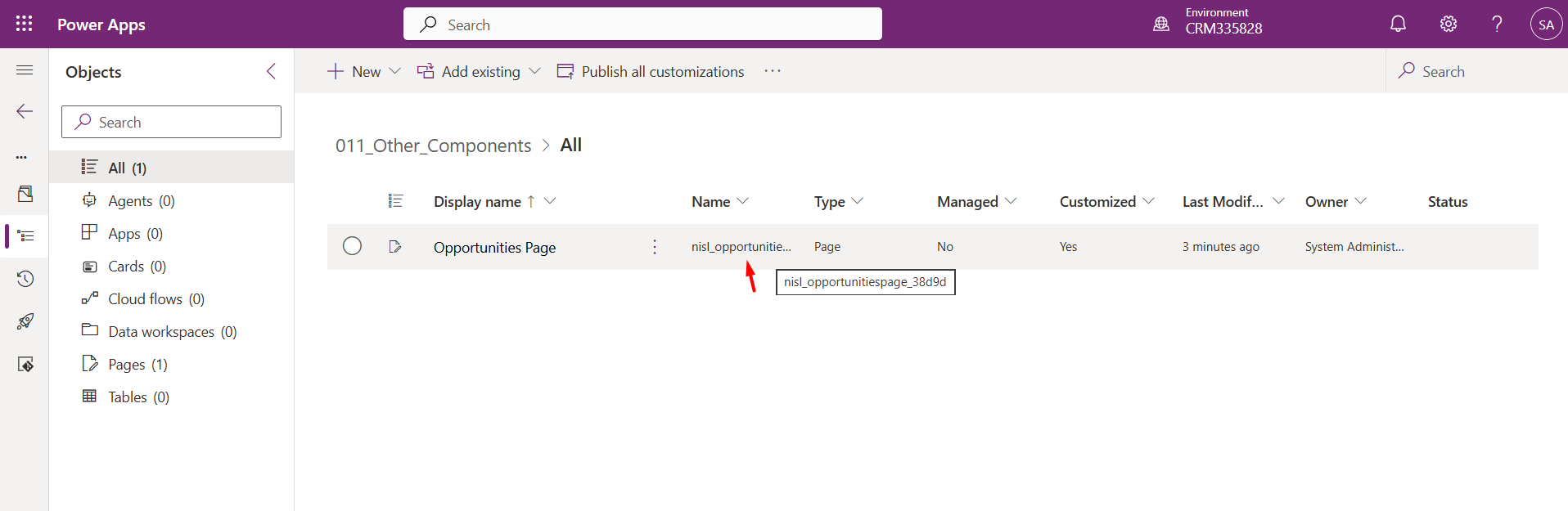 Copy the logical name of the Custom Page and pass it to the JavaScript function associated with the Opportunities ribbon button.