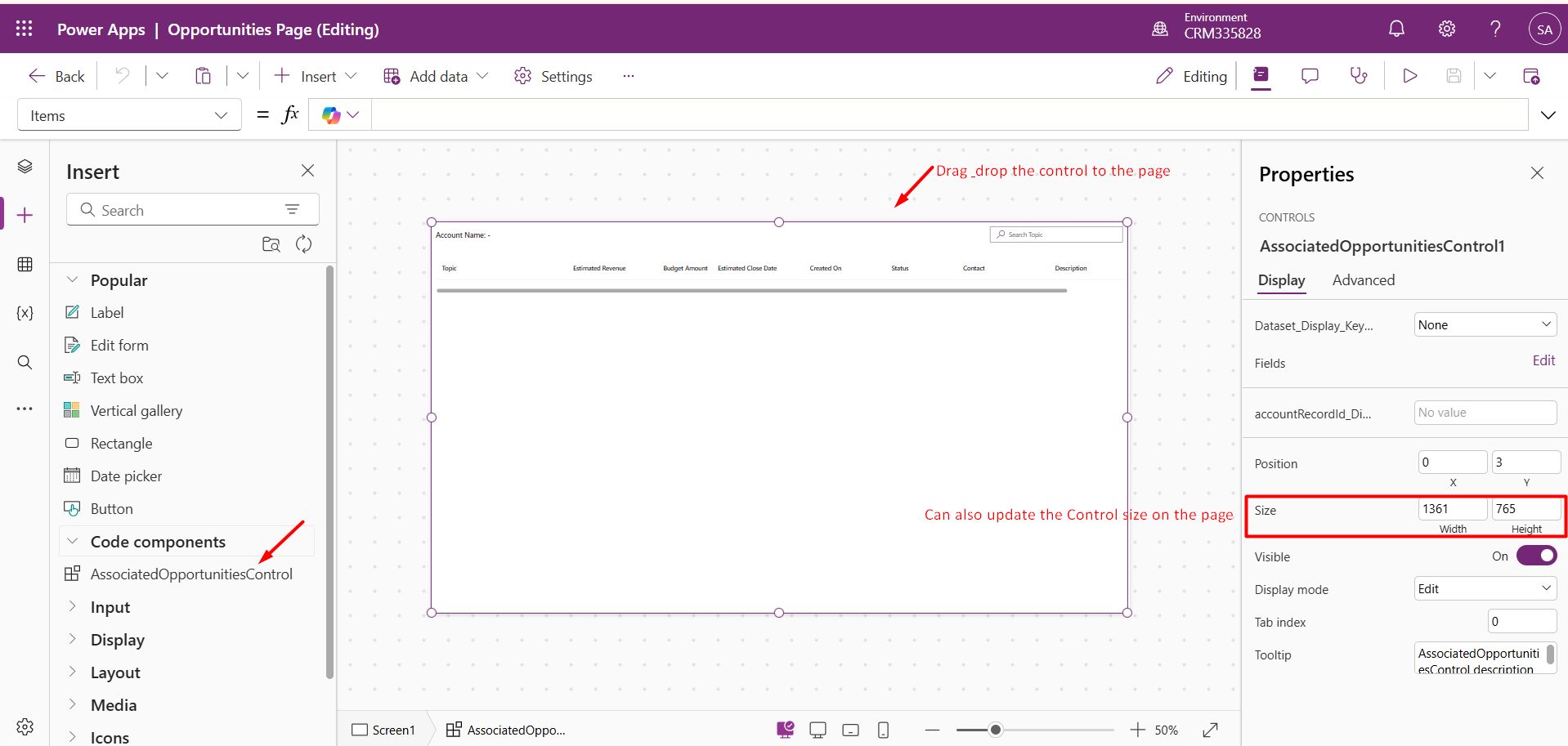Drag and drop the PCF control onto the Page, adjust the size, then Save and Publish the page.